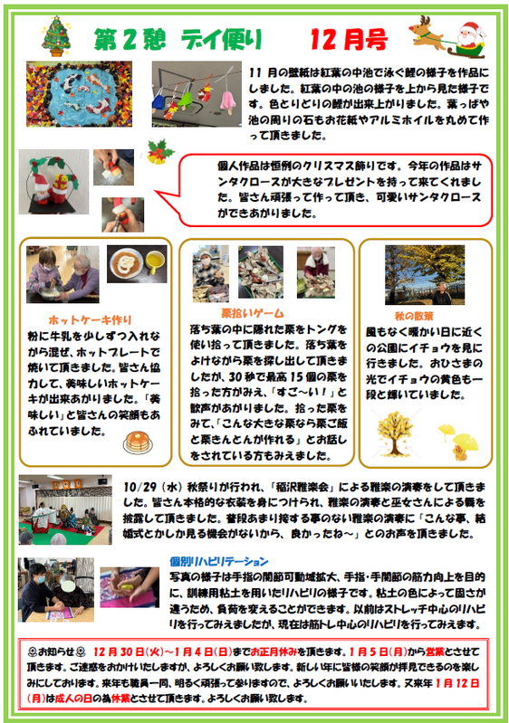 第2憩の泉では、10月29日に秋祭りを開催しました。感染症対策の影響で、ボランティアの方をお迎えできていませんでしたが、今回は『稲沢雅楽会』様に演奏を披露して頂きました♬