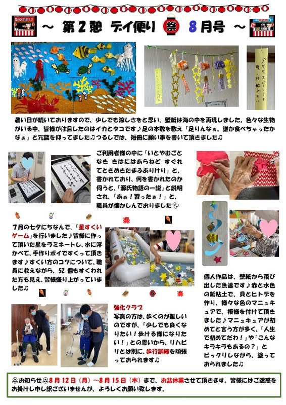 第2憩 デイ便り8月号を発行致しました。どうぞご覧ください。
